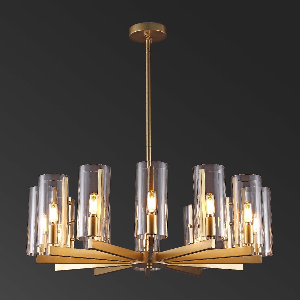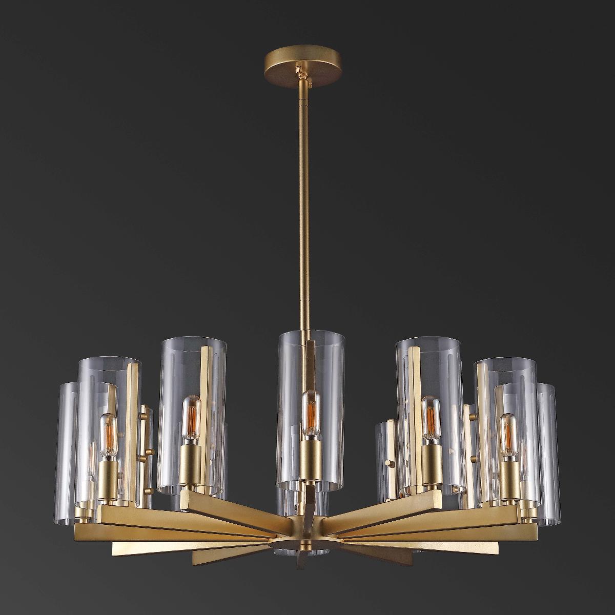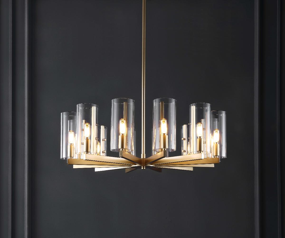 Indulge your decor in aristocratic elegance with this beautiful Benicio Chandelier. A modern take on the classic wagon wheel silhouette, Benicio's 12 clear glass hurricane shades are given a touch of retro-chic flair with vintage-style bulbs, and its shimmering gold frame makes Benicio a designer favorite.