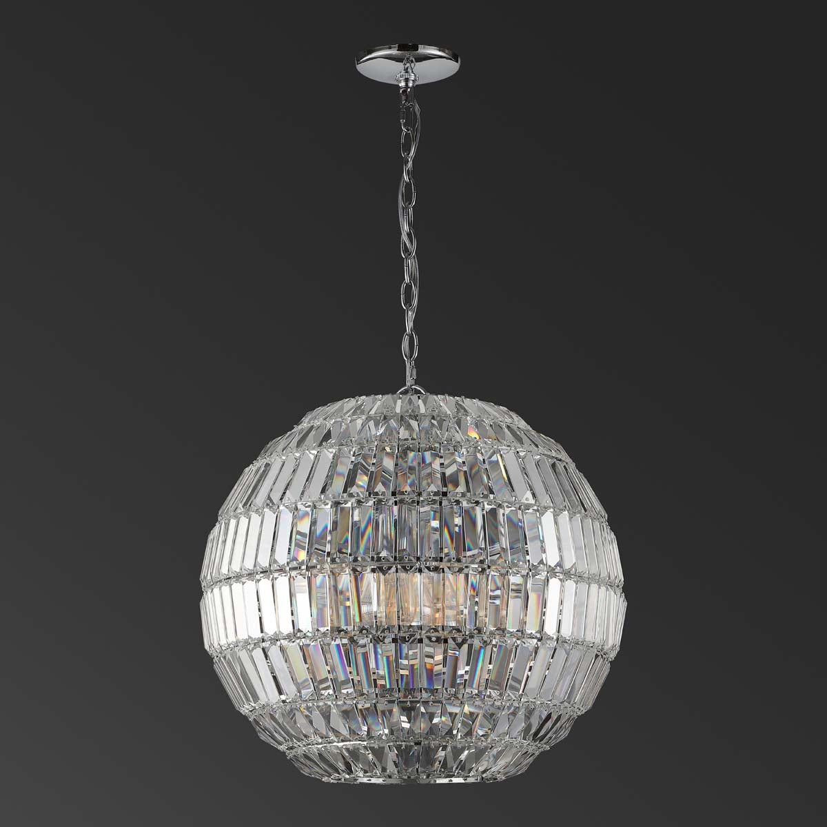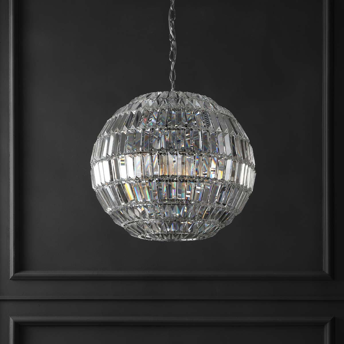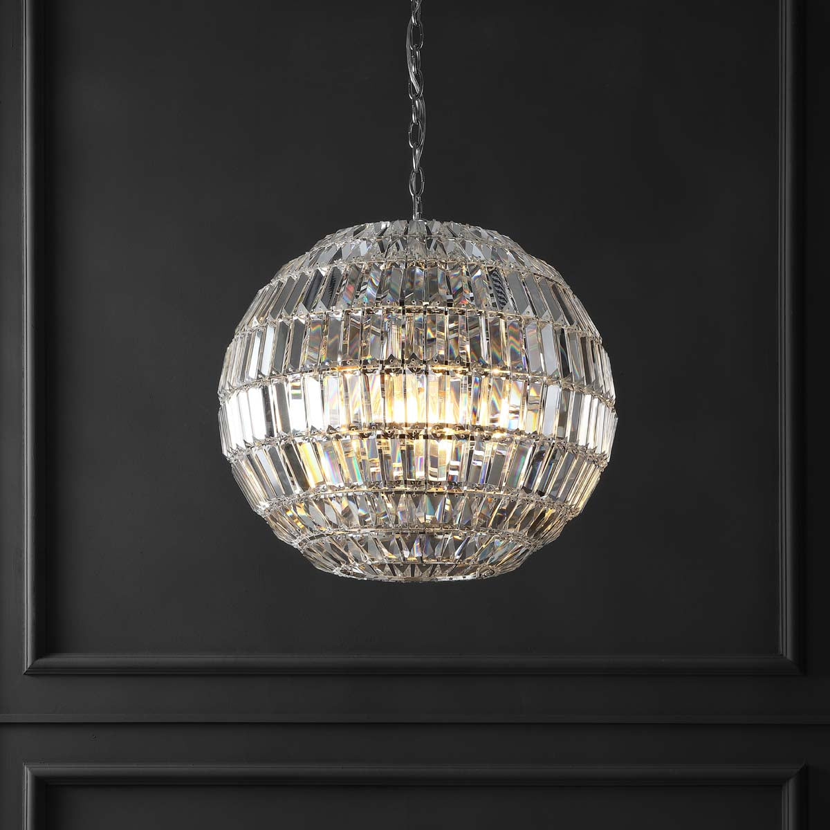 Give your decor a glamorous gala aura with this dazzling Demarco Chandelier. Sparkling with rows of elongated crystal prisms artfully arranged in a globe silhouette, Demarco creates a lavish interplay of light and shadow when lit, elevating any room to new heights of decadence.