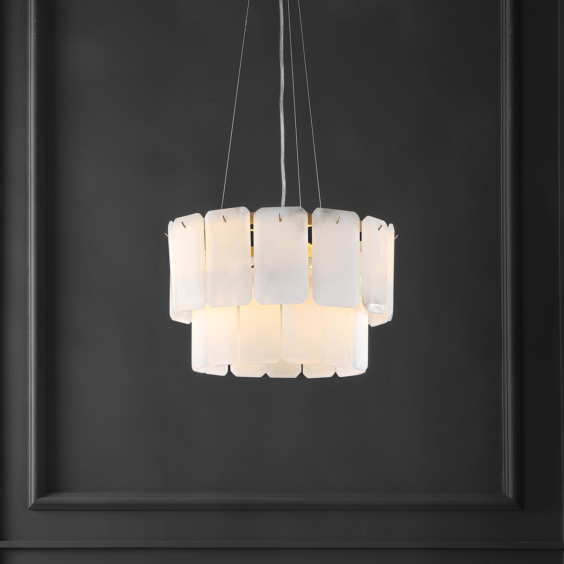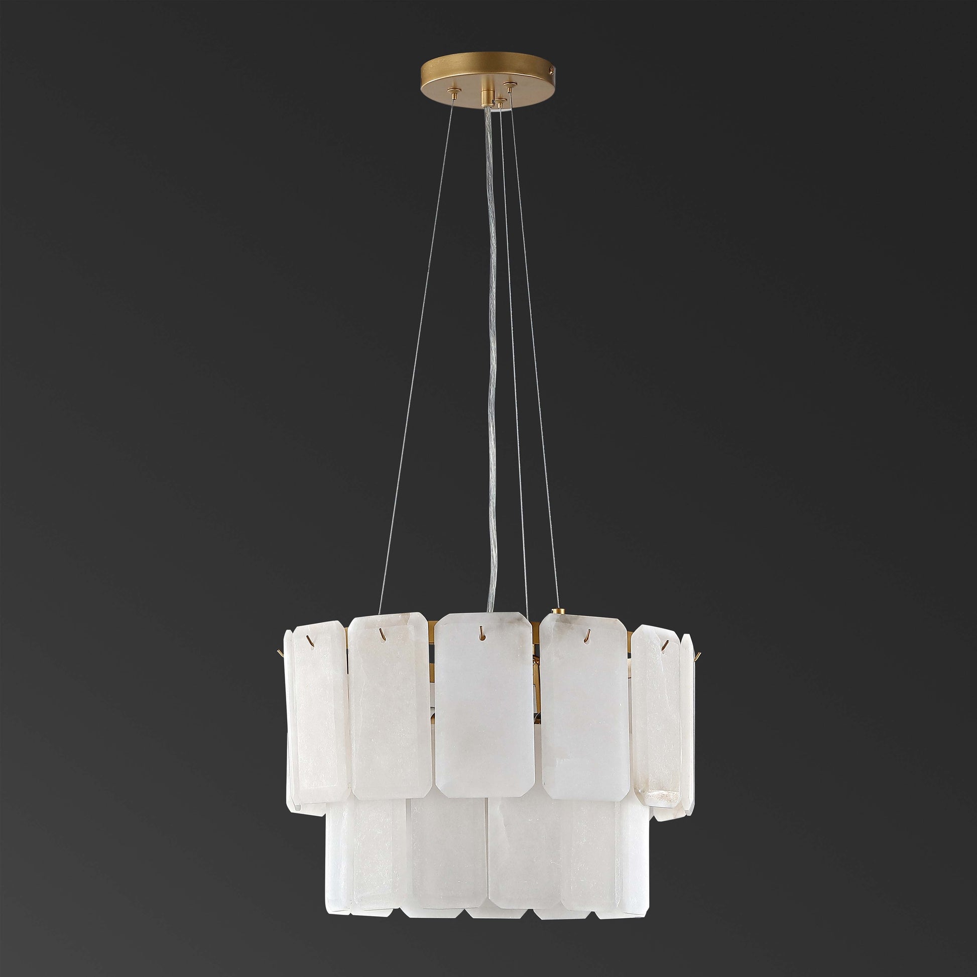 Give your decor a touch of graceful glamour with this fabulous Fernandez Chandelier. Two tiers of elongated white marble octagons conjure images of gentle flower petals, creating a lavish, airy look in any interior.