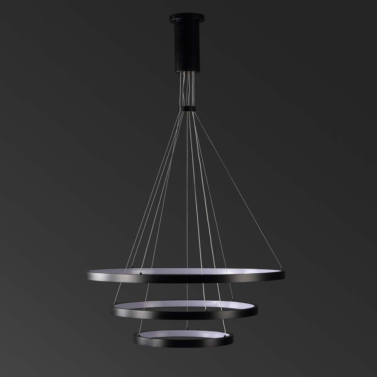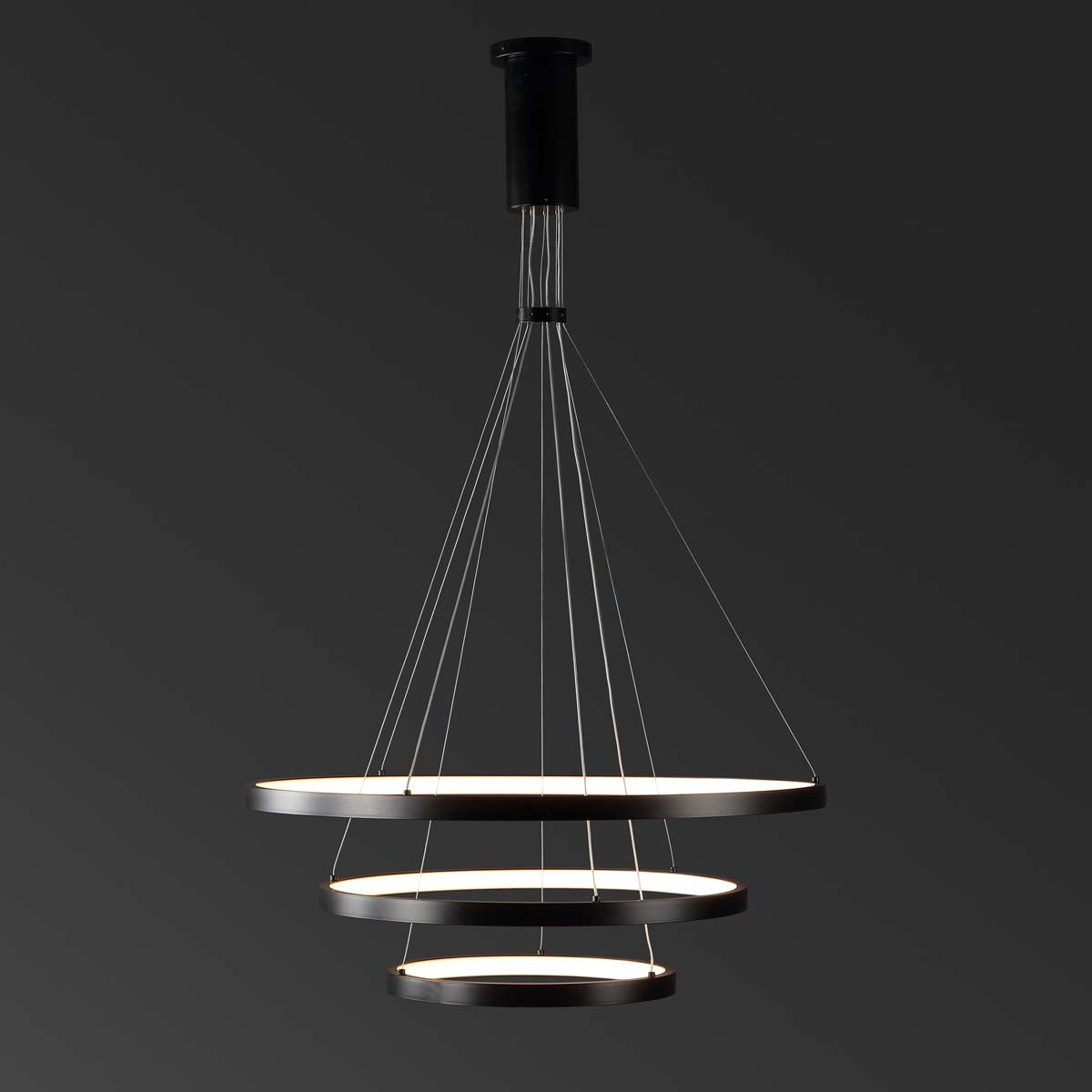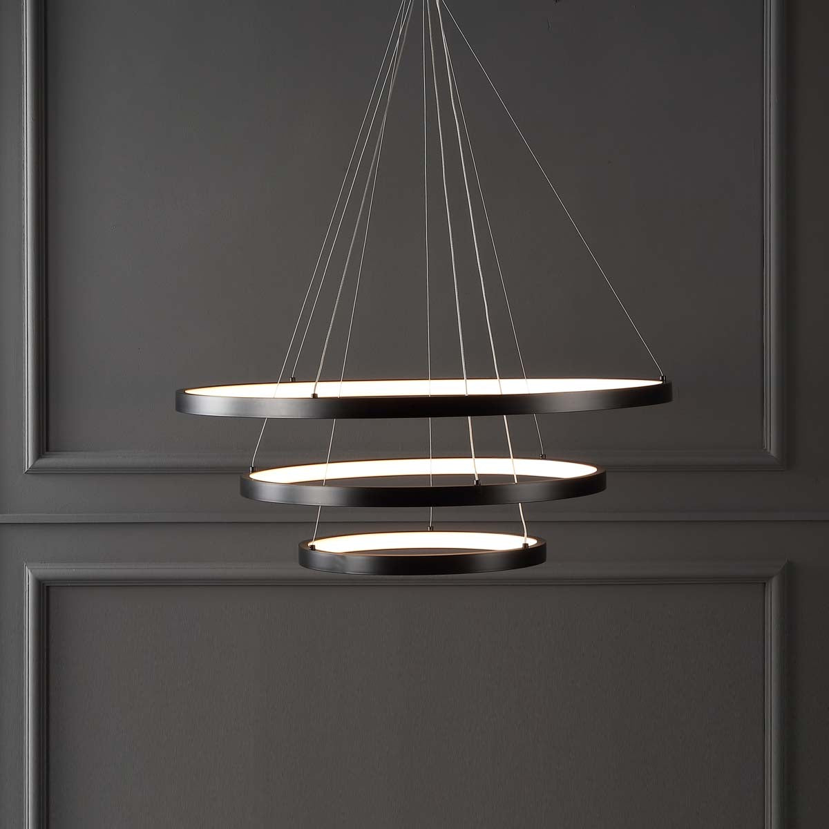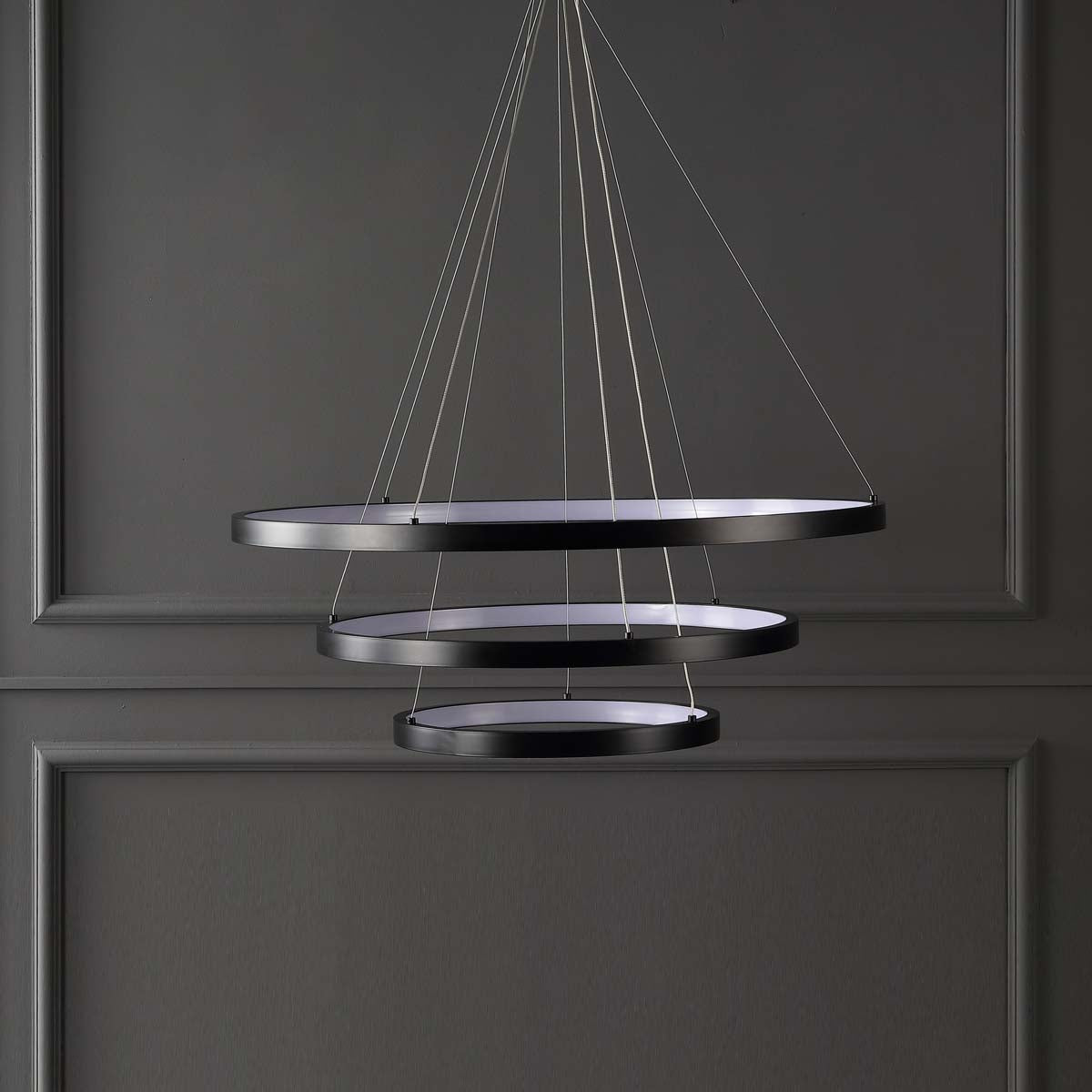 A minimalist expression of modern glamour, this Meranda Chandelier is in a class of its own. Three tiers of illuminated halos in sleek black metal cascade as if floating in midair, creating an illusionary display that transforms any living space with rich depth and motion.