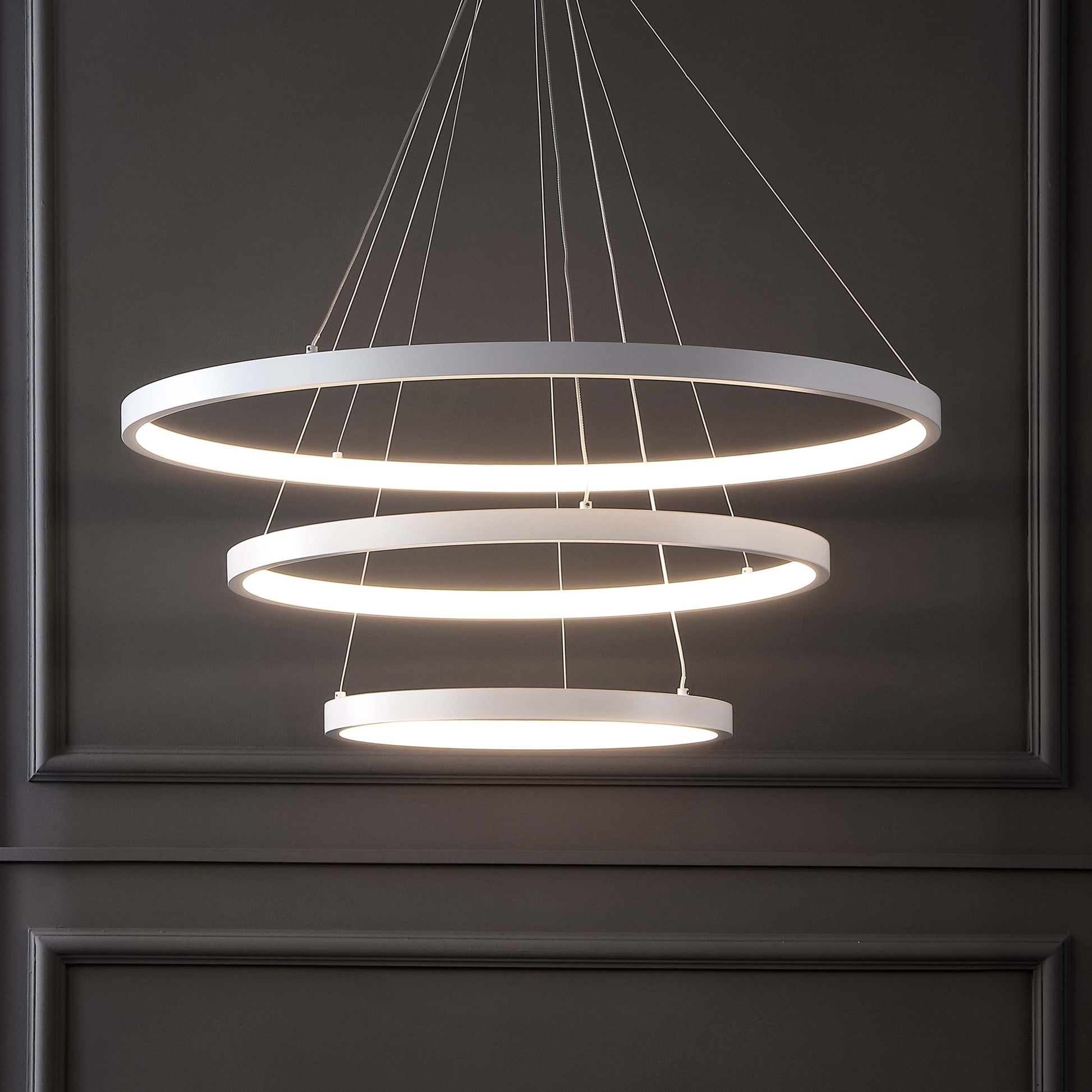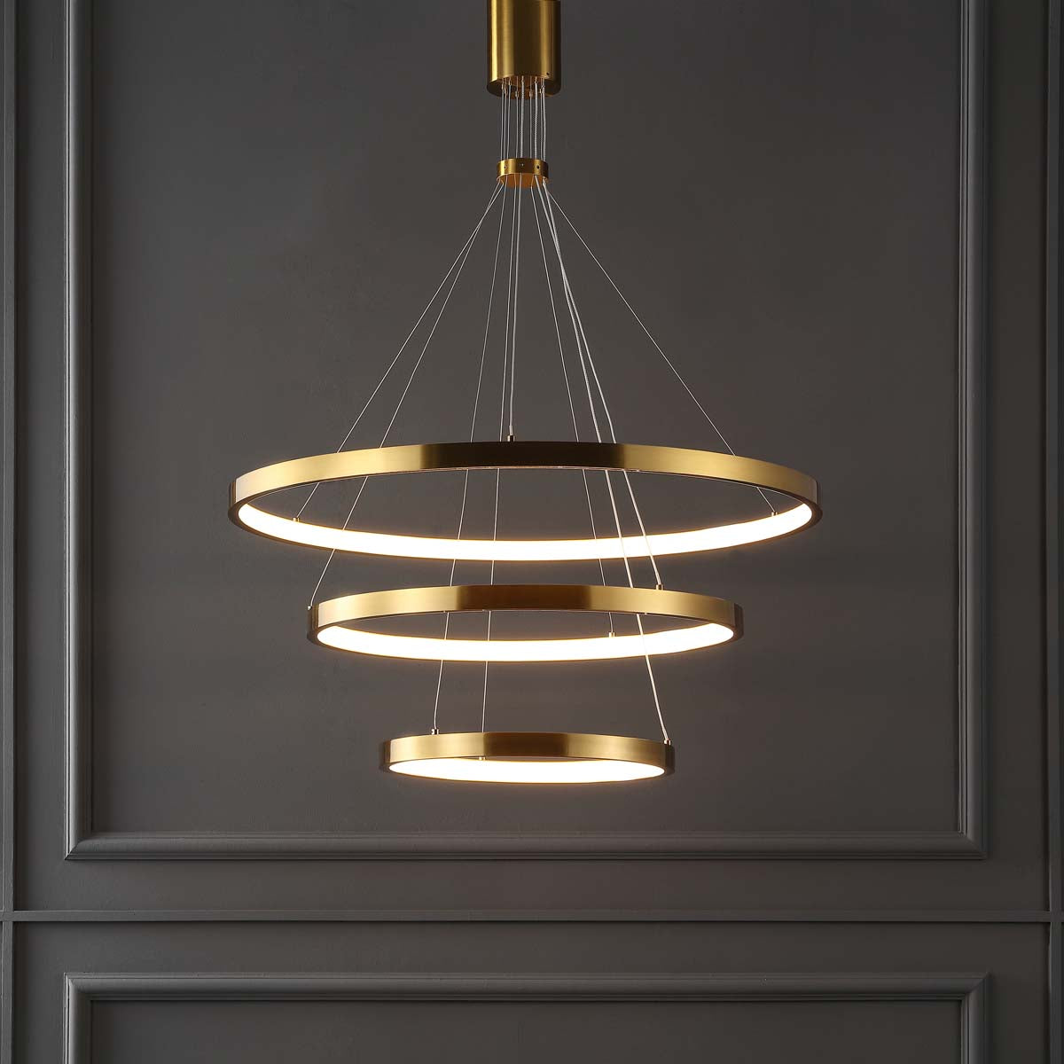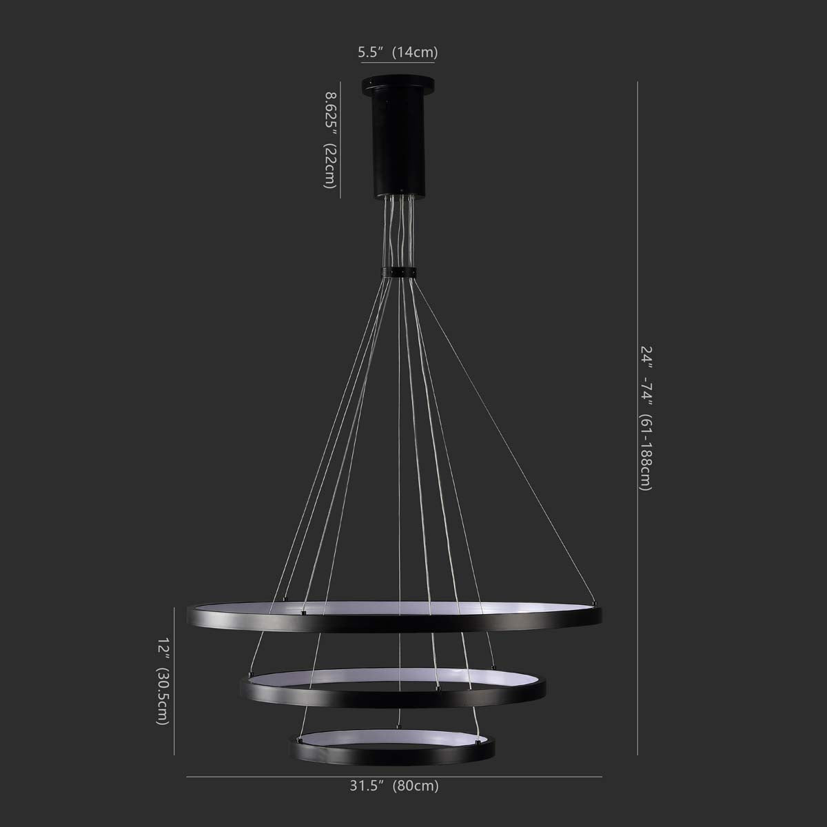 A minimalist expression of modern glamour, this Meranda Chandelier is in a class of its own. Three tiers of illuminated halos in sleek black metal cascade as if floating in midair, creating an illusionary display that transforms any living space with rich depth and motion.